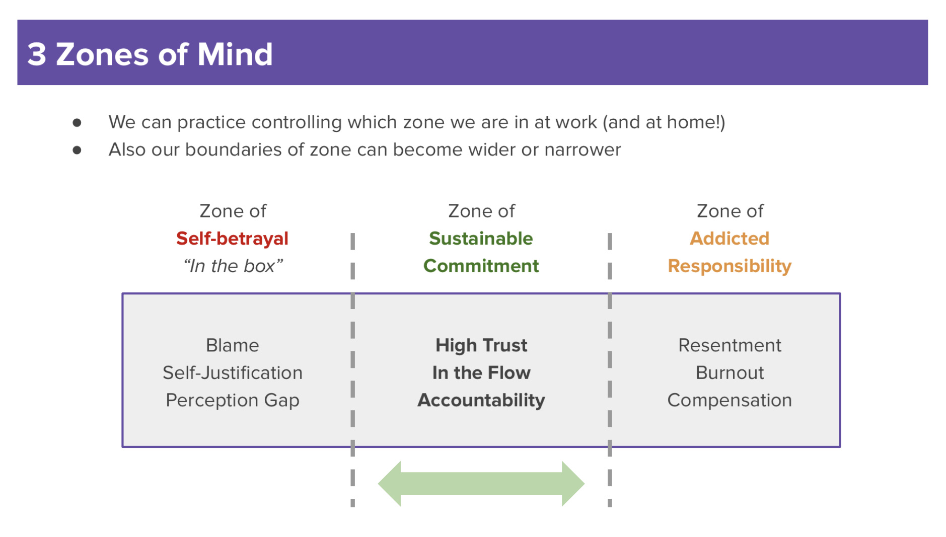 So it is up to us to be more cognizant of where we are in our own zone of minds and develop our methods to maintain the right position while training ourselves to broaden the zone of sustainable commitment, so that we can be a better partner to our colleagues and the loved ones.