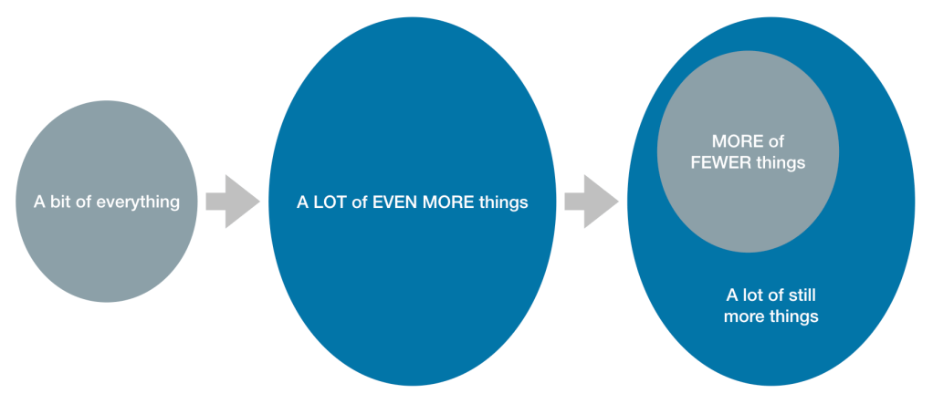 As we discussed earlier, the capacity of any individual will almost always be smaller than the need of a bigger organization. So as companies grow and each part of the business becomes more complex and requires deeper level of expertise, work start to become more specialized, and people end up owning (or influencing) more of a fewer things.