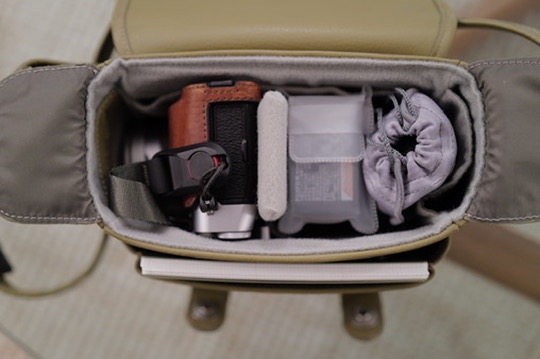 The camera, with a half-case and a hood, along with extra batteries in a case, a charger and power cable, a neck strap, and a small A6 notebook with a pen, all fit perfectly inside this messenger bag.