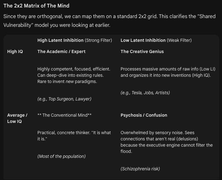 - The Danger (Low LI + Low/Avg IQ):Β If the floodgates are open but the engine is weak, theΒ Prefrontal Cortex (PFC)Β gets overwhelmed. Bottom-up sensory noise drowns out top-down control, leading to confusion, anxiety, or psychosis.