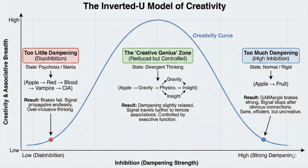 - Result:Β The dampening is slightly relaxed. The signal travels further than average, reaching remote associations (Apple β Gravity), but is eventually stopped by executive control before it becomes nonsense.